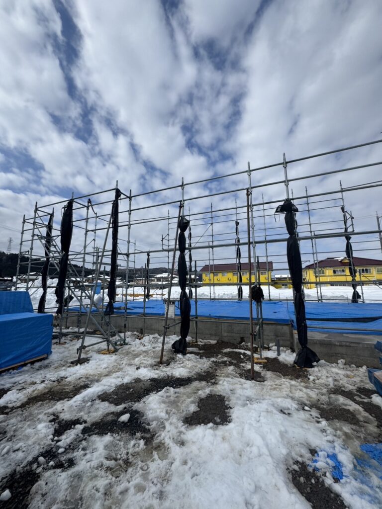元請さんが、足場組立場所の雪をある程度のけておいてくれたので、組立作業がスムーズに進みました。
