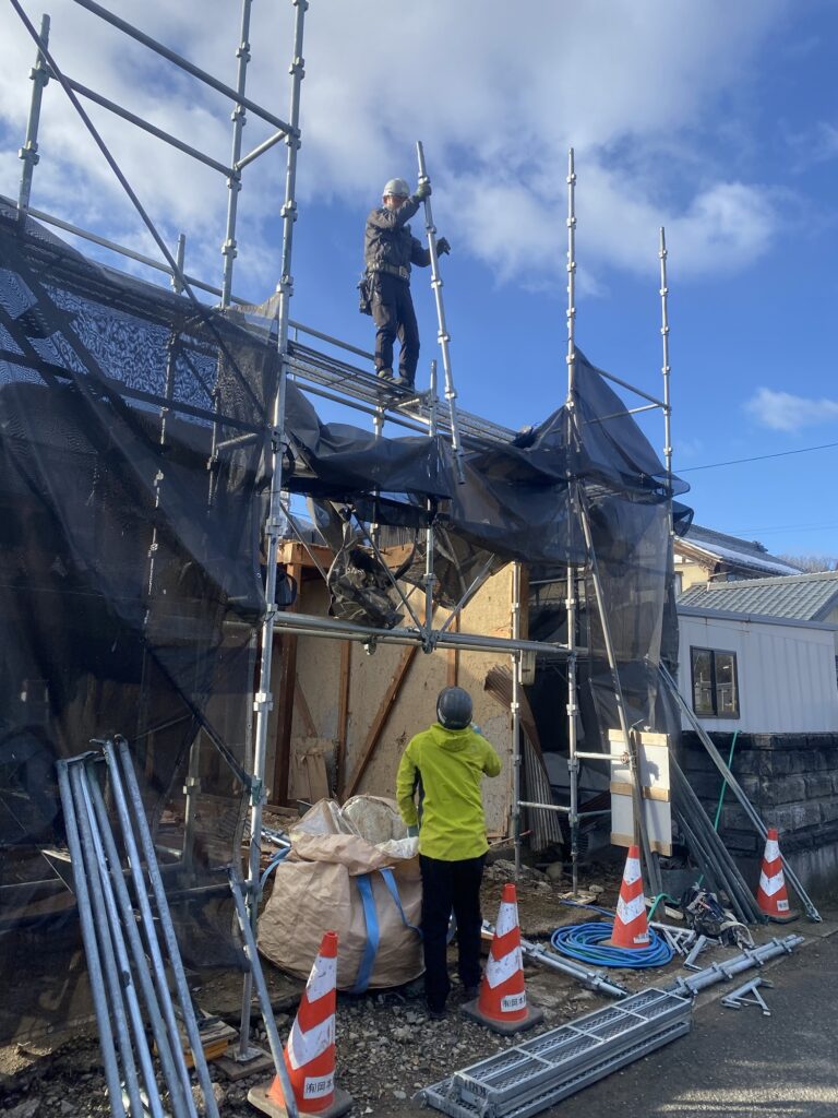 解体工事の足場は、解体の作業の進行にともない足場もおとしていきます。