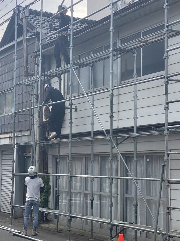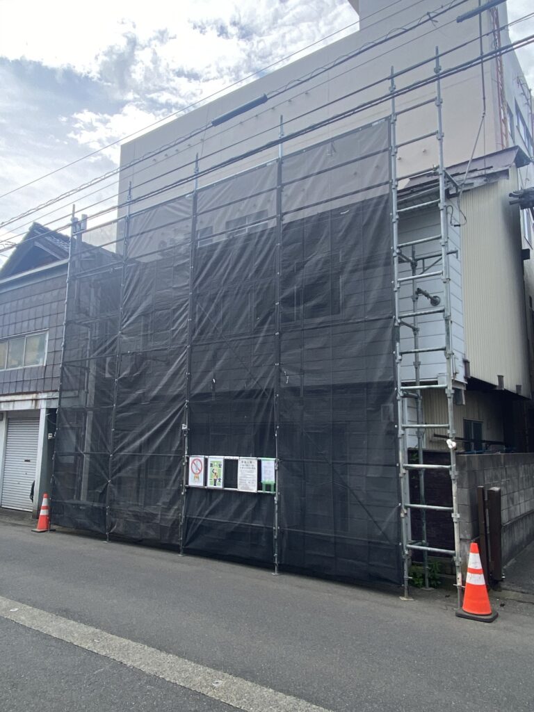 足場が道路に はみ出してしまうし、道路は車通りが頻繁にありトラックを停めれない為、道路占用許可(市役所), 道路使用許可(警察署)をとり工事開始となりました。