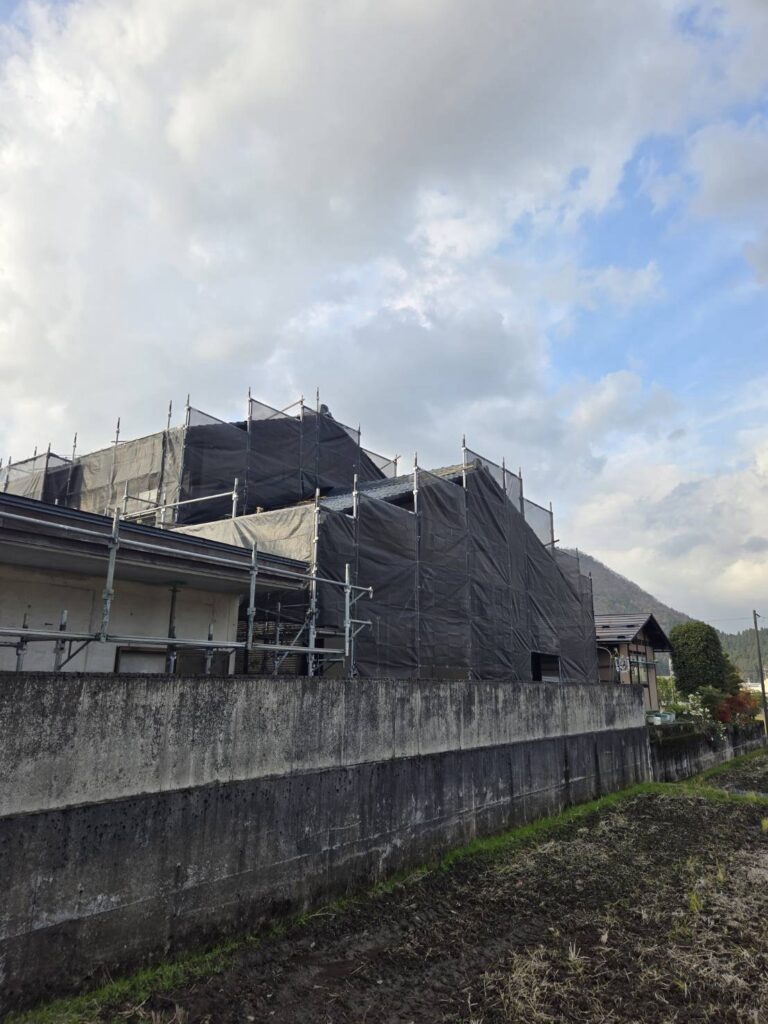 越前市改修工事現場. 足場組立おこないました。 今日は、天気☀️も良く作業がスムーズに進みました。 足場組立〜垂直ラッセルネット。