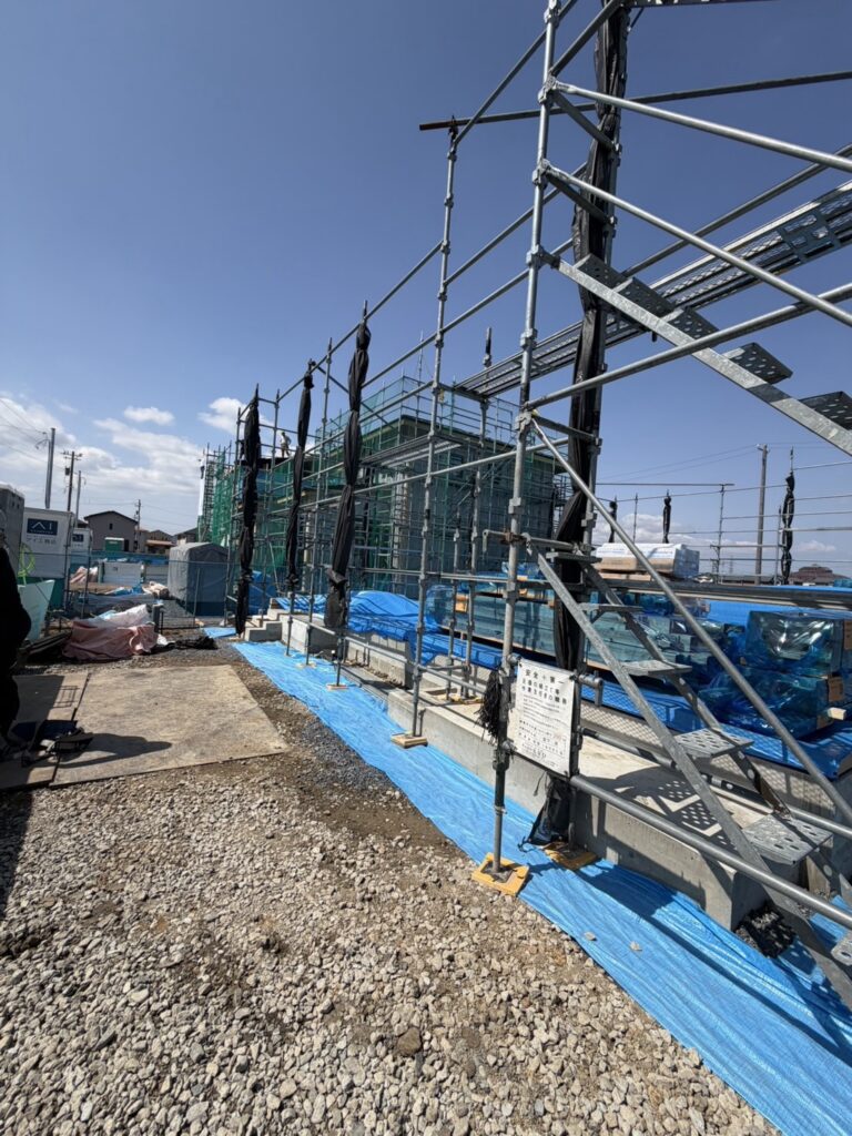 越前市新築現場. 先行足場組立おこないました。 足場組立〜メッシュシート。 今日は、久しぶりの雨☔️のなかでの作業でした…やっぱり暑くても天気がいいほうがいいですね。