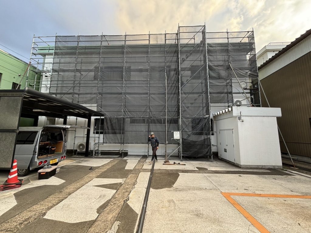 (改修) 外壁塗装, コーキング現場 足場組立〜幅木〜メッシュシート。