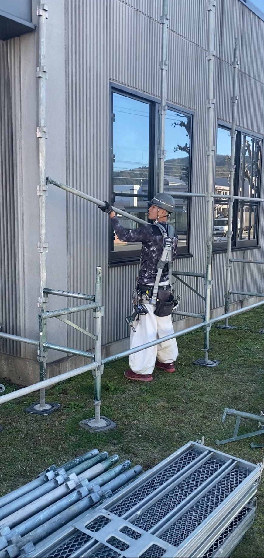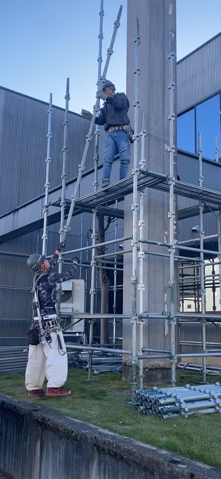 1日目に引き続き、足場組立作業を進めました。建物全体を覆う足場の組立を、安全第一で丁寧に行いました。
