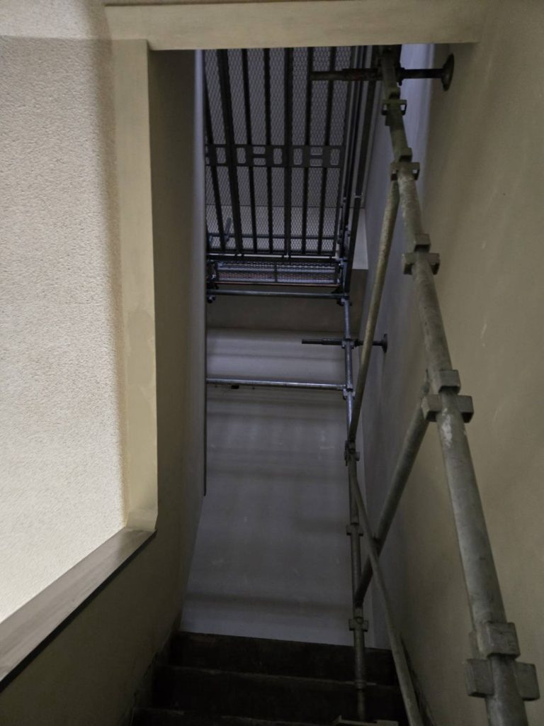 ペントハウス部は、事前にクレーンで資材荷上げをしておいたので組立て、メッシュシートを張る作業にすぐとりかかれましたが…室内階段間は、資材搬入,階段からの荷上げが大変でした。