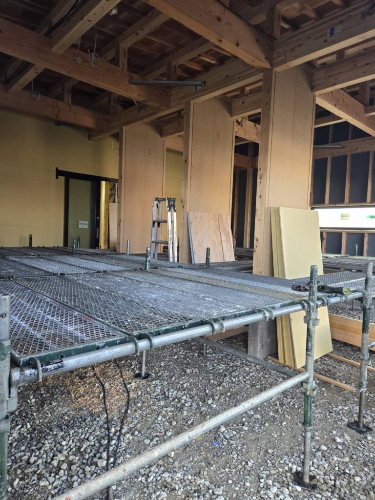 越前市木造新築工事現場. 車庫内ステージ棚足場組立おこないました。