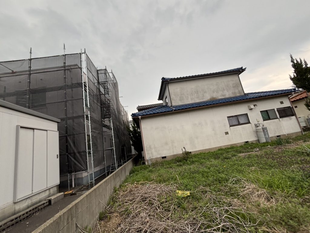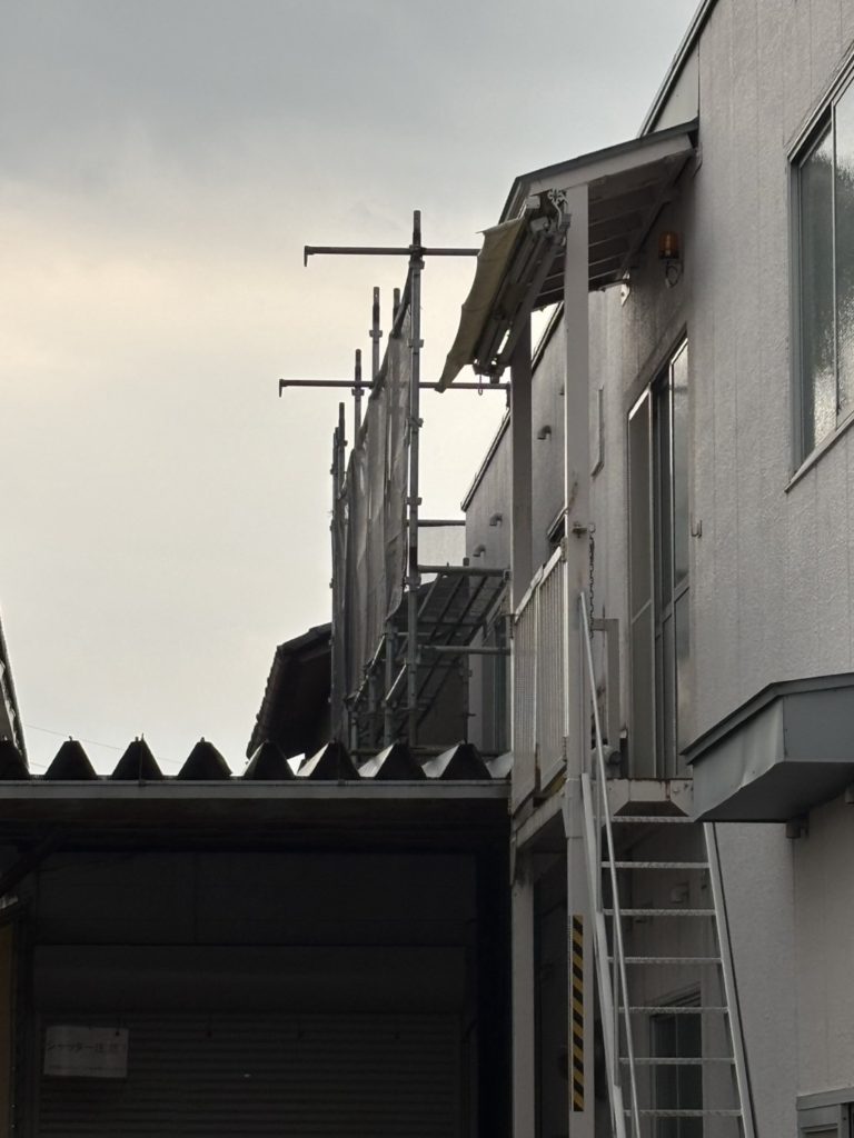 この現場は、お客様の都合により2工程にわけての足場組立となります。