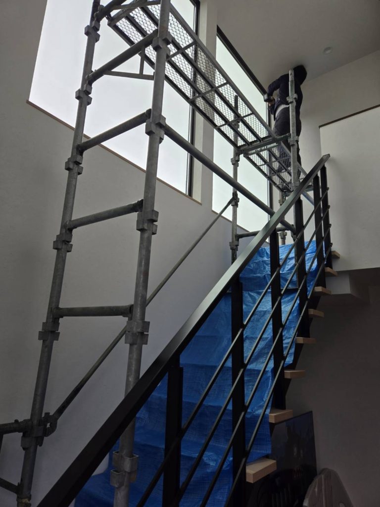 新築物件の室内にロールスクリーンを取付る為、階段間に足場組立ました。