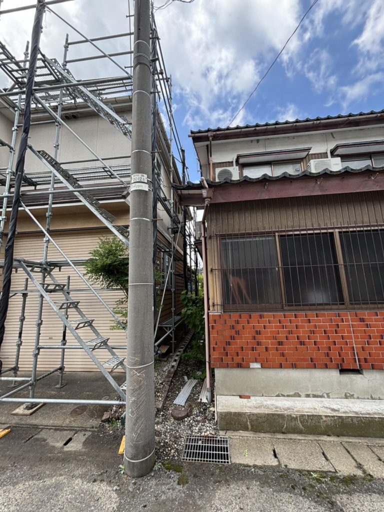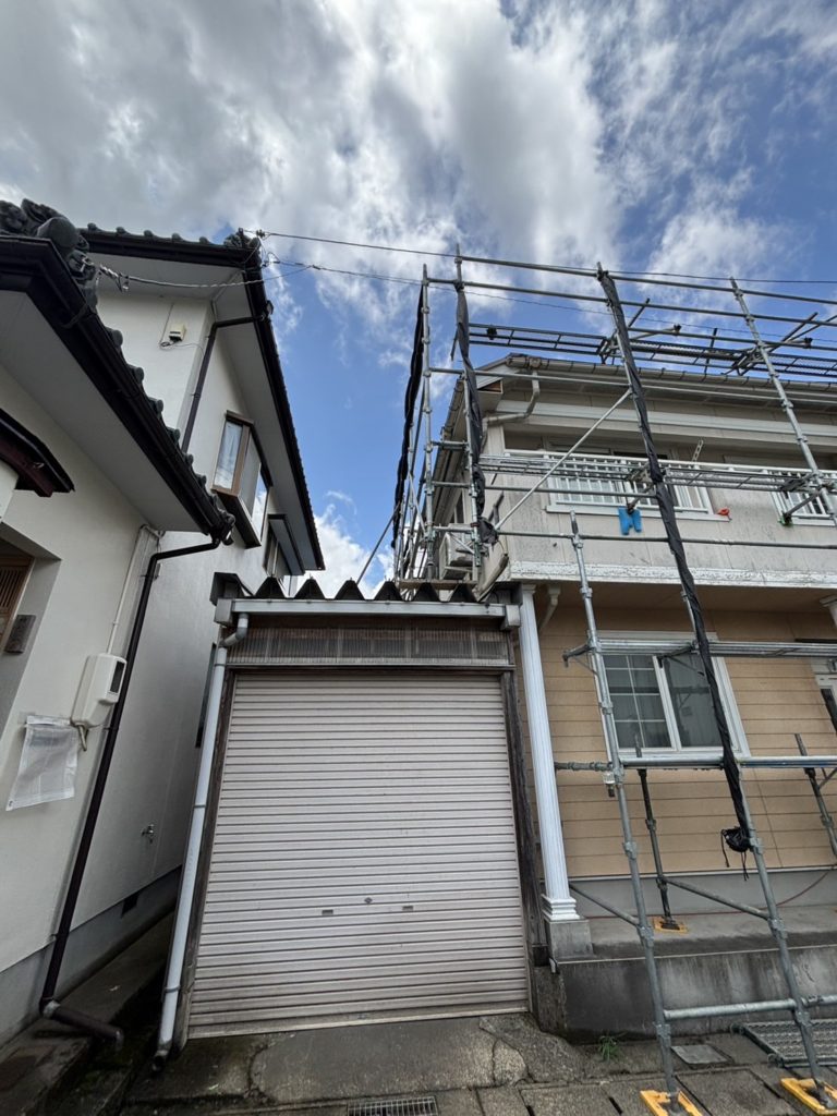 越前市外壁塗装, 屋根塗装工事現場. 足場組立おこないました。