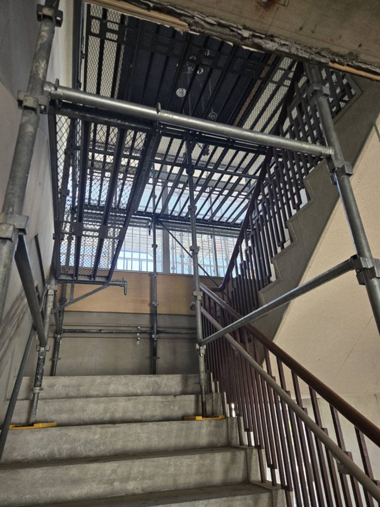 越前市某公民館改修工事現場. 室内階段間足場組立おこないました。