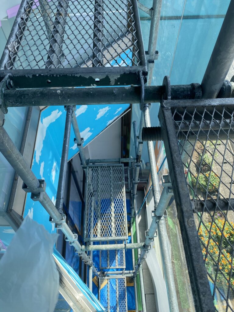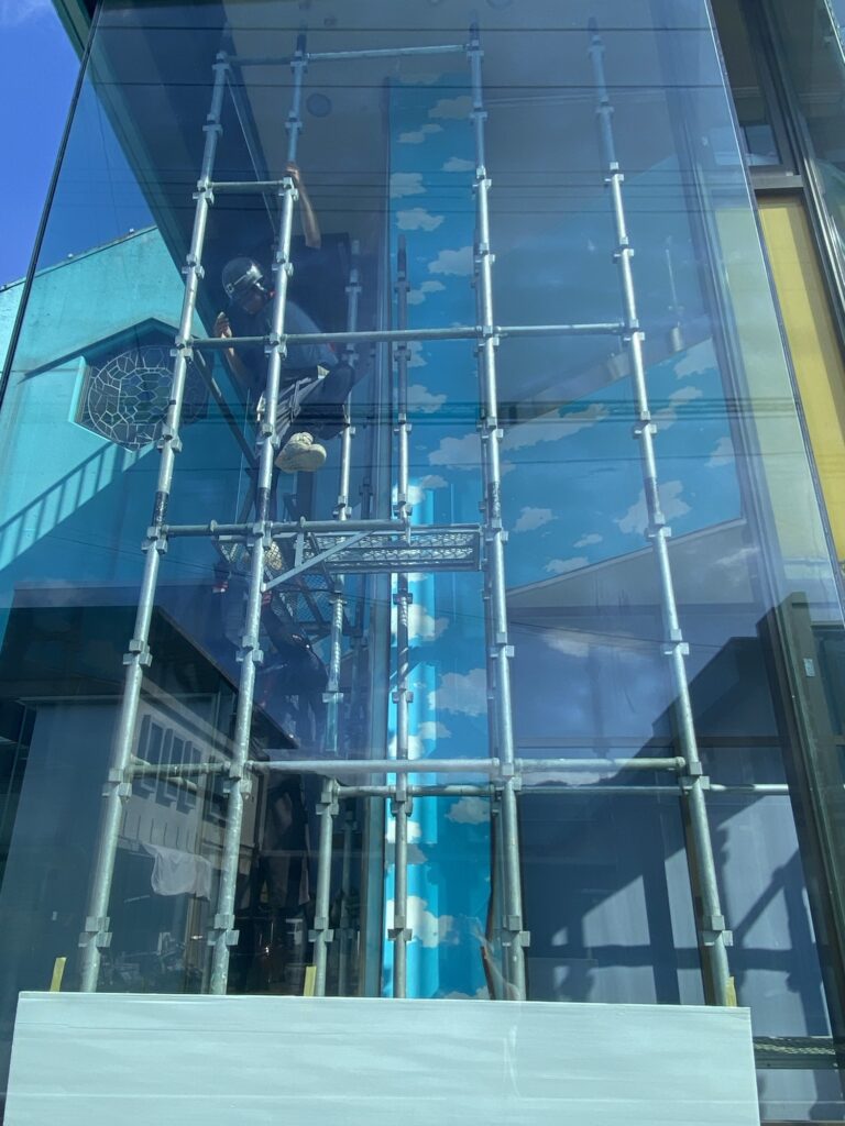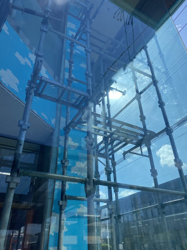足場組立場所は、非常に狭く周りはガラス張りになっていて、搬入, 組立と気をつけながら慎重に作業いたしました。