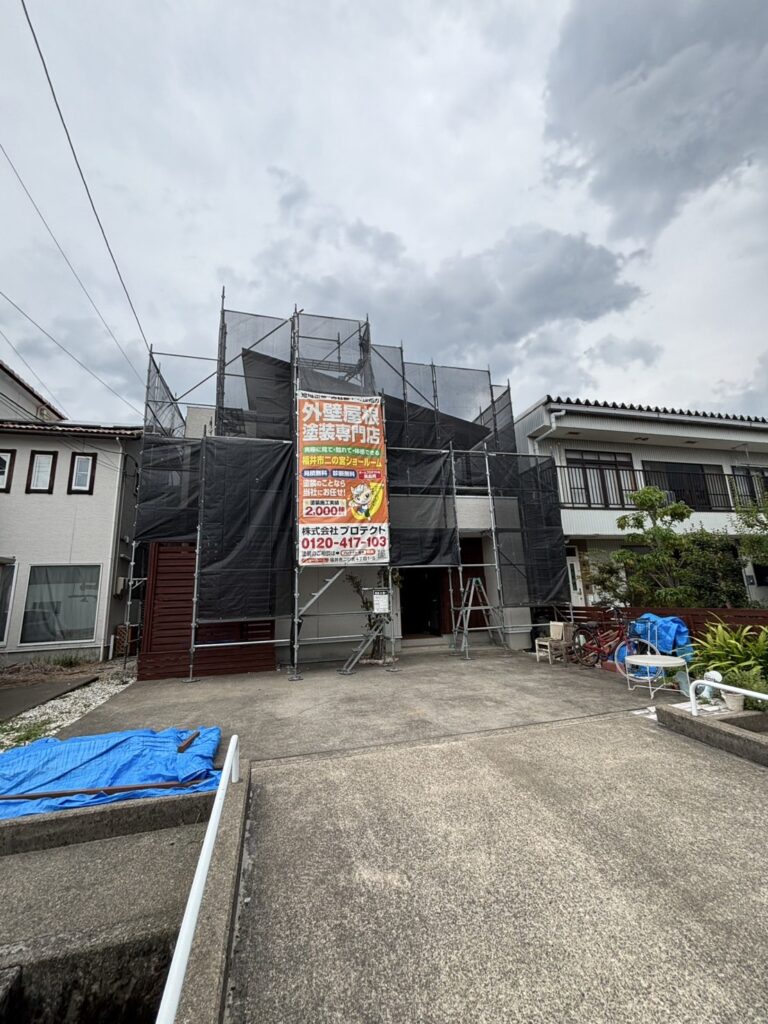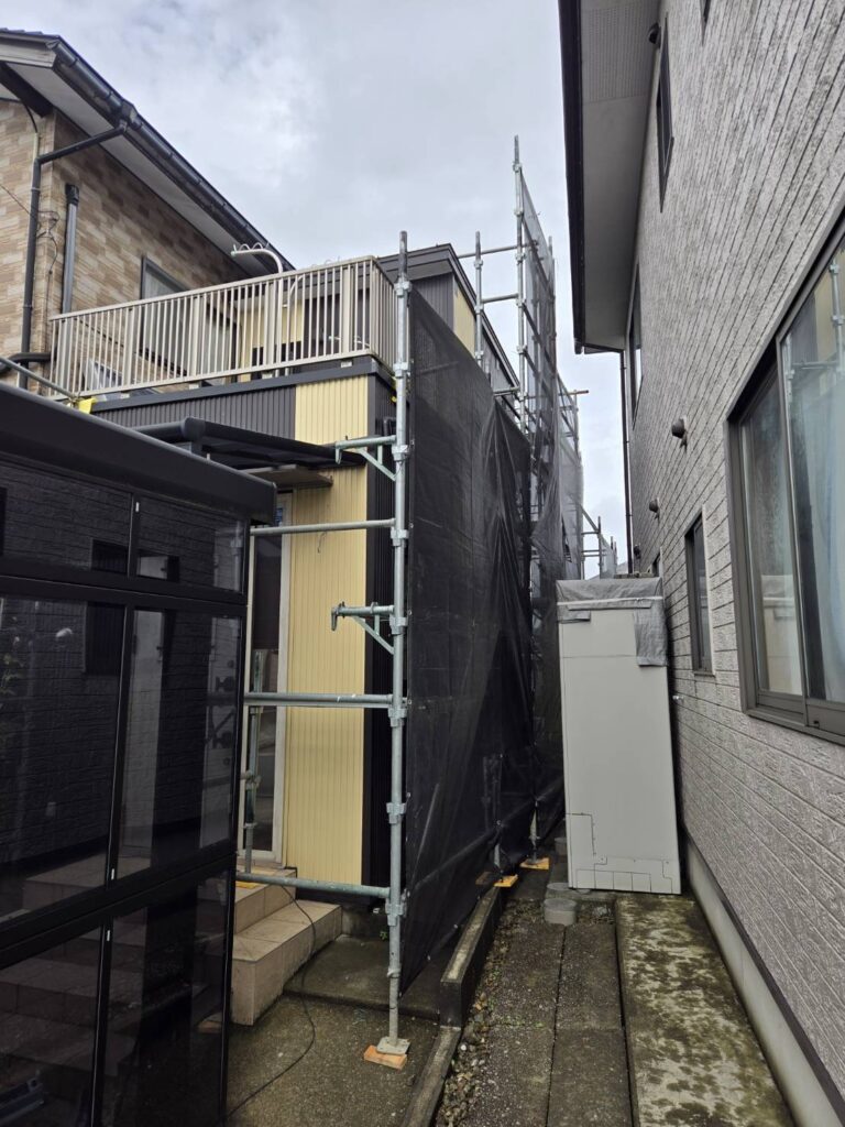 福井市外壁塗装工事現場. 足場組立おこないました。 住宅街で周りの敷地も多少狭く、資材配り, 組立と気をつかいながら作業致しました...